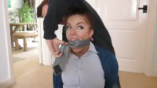 Prepare, Miss Scarlett, for a full-on monster gagging comprising of thick handkerchief, bound in place with three tight jerks and a knotting of your own silver necktie, in turn mummy wrapped over, with skin tight adherence, by multiple twists of extra sticky tape. Now thats a gag, and if any hot little bitch needs it, its you. Let's get stuck in, and marvel at how this stunning redhead bends and twists her way through this face breaking barrage!