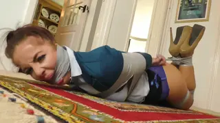 Mercilessly bound up into a tight tape hogtie while she bucks and twists her perfect round yet muscular dancers rump in his face, Scarlett is the pinnacle of hotness. He swats her arse again and again as he corrals her. Now try getting to your phone, you unruly little tart! She continues to thump around on the carpet, mega-restrained and absolutely livid. Is she EVER going to get out of this? Doesn't seem like anytime soon, so if you don't mind, Mizzzz Scarlett, well settle back in and have a damned good stare up your skirt at your blue panties while your face is continually put on jaw lock down by that monster gag there. If you enjoy seeing a very beautiful woman put through the total gagged up mill, then this, is for you!