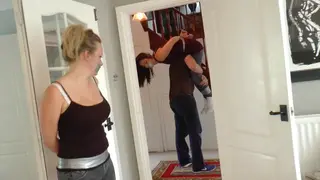 We hear some exciting mmmmmpppphhhhing coming from the hallway and suddenly, two very sexy plainclothes girl detectives in tight jeans and sneakers are brought into view, squirming mightily over a masked man's shoulder, one by one. They are dumped to the carpet and left to struggle, bound hand and foot, their delightful mouths sealed with tape strips. Of course, they have been captured while snooping around outside. Grabbed and dragged through a dense treeline and then darkness... now this. But the girls are fighters and want very much to escape before this demented villain starts to hurt them! So as soon as he heads off to find more tape (are they not restrained enough yet??) they are quickly in back to back, trying to free one another from their sticky bonds.