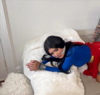 Superwoman received an urgent call about an emergency! A house was on fire, and a man was trapped inside, needing immediate rescue! She flew straight to the scene, bursting past the onlookers and into the house. Rushing into the lounge, she found no flames, no smoke—nothing. “Hello! Is anyone here?! I heard there was an emergency, and I’m here to save you!” she shouted at the top of her voice, but there was no response.Suddenly, laughter erupted from behind the sofa. Confused, Superwoman froze, not understanding what was happening. “Well, well, well, so easy to lure in when you think there’s an emergency, Superwoman,” a masked man sneered as he edged toward her. Superwoman’s eyes widened in shock—it was her enemy! “YOU!” she screamed as he crept closer. The masked man was ready, but Superwoman reacted swiftly, grabbing him by the neck and lifting him off the ground with her super strength. A fierce fight ensued, and Superwoman overpowered him with her superpowers, beating him down!Now sprawled on the sofa, the masked man had anticipated this. He had Superwoman’s one weakness. From a secret hiding place, he pulled out kryptonite, and its green glow filled the room. Superwoman’s powers instantly drained, leaving her far from full strength. The buzz of the kryptonite intensified as he held it toward her, further disabling her abilities. Pressing it to her neck, he rendered her a mere mortal.Superwoman was now taped to a chair, her feet bound and her wrists tied in front of her, securing her to the seat. A cleave gag muffled her mouth, causing her to drool and gag-talk as she struggled. She wriggled and fought against the restraints, but with the kryptonite now fashioned into a devastating necklace around her neck, she had lost her powers and did not have her super human strength. In the darkness, only the green glow of the kryptonite illuminated her. Superwoman couldn’t see the masked man until he switched on a spotlight, flooding the room with light and temporarily blinding her. He approached, his hands groping her huge boobs through her outfit. Lifting Superwoman’s skirt, he revealed her tight red panties and rubbed her juicy pussy lips through the silky fabric.The masked man then whipped out his cock, removed her gag, and Superwoman began sucking it. Again and again, she took it down, drooling, gagging, and spluttering. Now ready, the masked man used his own superhuman strength to lift Superwoman, still bound to the chair, and carry her to the sofa. He positioned her in doggy style, the kryptonite necklace still paralyzing her superhuman abilities. Moving her panties to the side, he began to fuck Superwoman. “Ready to be impregnated?” he taunted. Her eyes rolled back as she took every inch deep inside.The masked man fucked Superwoman relentlessly as she creamed all over his cock, encouraging him to thrust harder. Flipping her onto her back, he positioned himself between her legs, fucking her pussy balls deep. He continued until he was ready to finish. With one final act, he blew his hot cum all over Superwoman and the kryptonite, covering her completely.