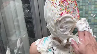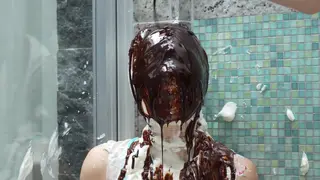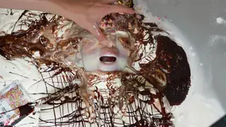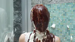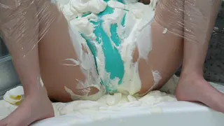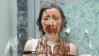 她甚至无法取下粘在脸上的纸盘,然后穿上长袜,奶油涂抹在脸上。