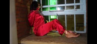 Sarah wild was enjoying a wind down before bed time. She goes for a drink before hitting the sack and that's when she hears a noise from the hall. The sexy satin dressed milf goes to investigate and that's when she is jumped from behind, grabbed and hand gagged before being dragged away. We next see sarah bound hand and foot with her own satin scarves. She protests but only gets a knotted satin scarf cleave gag for her troubles. Left to struggle while the thief looks for loot she attempts to call for help from the window but she is unable to get any attention. Knowing this is not working she hops bare footed to the bedroom door and listens out to see if the coast is clear. She takes a peek through the door and finds the man nowhere around. She now thinks the coast is clear and hops towards the front door. Dressed in her satin pyjamas and bound and gagged with scarves she gets so cl9se to the door and that's when the thief reapers and grabs her. He then drags poor sarah back to the room and slams the door behind him