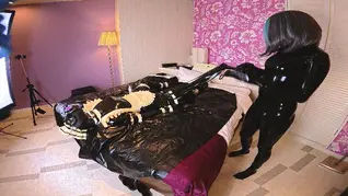 ラバーに身を包んだメイドが、仰向けのままガニ股に広げられ、完全に無防備な姿を晒す。