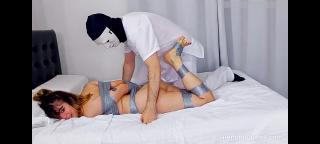Taking advantage of a brief moment alone, Nani hops toward the door in a desperate escape attempt—only to be caught again and tossed back onto the bed! Now it's time to secure her even more. She's hogtied with more tight tape, leaving her completely helpless and thoroughly silenced. MMMMMMPPPHH!!!