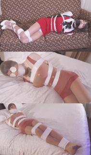 Then we see Stella in the bedroom, fully pantyhose encased and taped up with white pvc tape over her cute dress. She struggles on the bed and enjoys the feeling of being encased. After a few minutes Sandra comes back and adds a blindfold, putting round makeup sponges over her eyes and securing them in place with semi-clear tape. Stella continues to struggle and then Sandra returns and lets her know that she's going to let her struggle for a few more minutes and then she'll let her out. Stella agrees and then is surprised when she hears the hotel room door open and close. Is Sandra still here in the room with her? Stella starts to realize that she may be staying encased a lot longer than she expected!