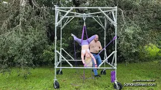 Zonah Bellum's aerial prowess meets its match as Ben, broad shoulders shirtless above trademark blue jeans and black boots, grips her inverted form, pulling her into predicaments with commanding hands. Zonah’s spandex leggings-clad legs, thighs and buttocks become wrapped in rope like a vice, the fabric shimmering under the sun, while her bikini top strains to contain her upside down C-cup tits, pulled to earth in gravitational vulnerability. Purple ropes entangle her body, linking her to the wheeled structure of steel, as she hangs helplessly in M.O.N.S.T.A.R. 's arms – a sensual siren seized within serenity, her restraint brings a surge of relief, rope allure amplified in this asked for outdoor ordeal.