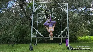 Zonah Bellum, graceful, petite aerialist with blonde tresses, dangles upside-down in the Department of Bengineering's steel frame The M.O.N.S.T.A.R. System*, her lithe body laced in purple ropes that bind her wrists, ankles, and waist with wicked whimsy. Her yoga pants stretch taut over curvaceous hips, hugging every inch of her toned legs, while the bikini top barely contains her bouncing breasts, exposed to the outdoor breeze amid the trees. Knees bent and sneakers pressed against only the air as her feet point and flex throughout transitions of real-time restraint. Zonah's suspended struggle evokes a daring dancer defying gravity in delicious damsel delight.