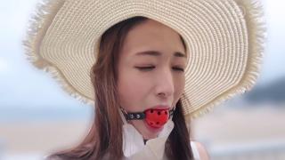戴着红色口球上街的女孩。。口罩遮盖