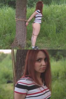 现在,她被牢牢地绑在树上。她能挣脱束缚吗?还是只能被困在森林里,无助地……The girl walked through the woods and found a bag with ropes. She really wanted someone to tie her, but there was nobody around and she tried to tie herself. She tied the rope to the tree, made a loop from the second rope, put her hands into it and the loop tightened, it turned out that the hands are tied behind the back and tied to the tree. Then she saw that a man had approached her, but she would not be able to escape or run away ...