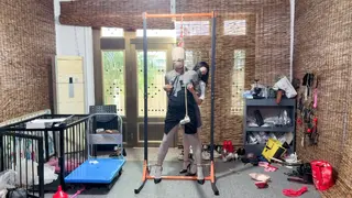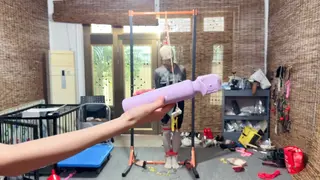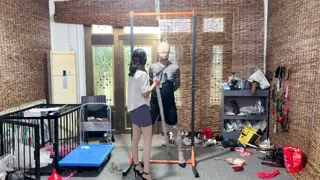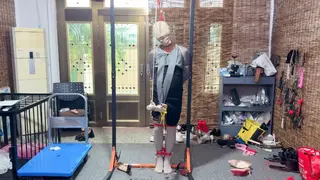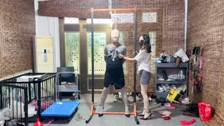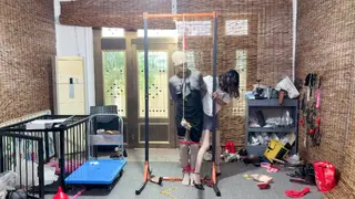 玩家上半身简易直臂,双腿强制分开,固定在支架两侧,脖子吊起,穿着十厘米高跟鞋,瑾年拿出木棍,卡在玩家下T,紧紧向上绷住,ZD棒前后固定,分别对应前后敏感点,瑾年不断地揉捏挑逗着他的R头,随后将两腿解开,脱下玩家高跟鞋,脖子上的绳子变得更加紧,只能不断踮起脚尖进行休息,瑾年看准时机,挠脚心,玩家只能不断晃动进行躲避。绑上直腿缚,两腿之间夹着棍子,私密处的[X_X]更加强烈,两个ZD棒不断摩擦着下T,瑾年拿出电J片,贴在玩家敏感的R头处,开至50,玩家的X部不受控制的开始颤抖,连着胳膊,抖动着,......