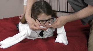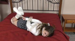 Mia is studying at home when an intruder ties her up. She tries to reach for the phone by her bed, but before she can dial, the intruder catches her and tightly hogties her.