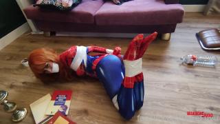 Spiderwoman enters through the window to see that a house has been robbed... when suddenly she is caught and tied up and gagged!!!!