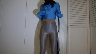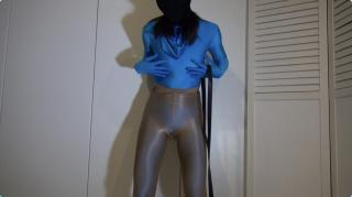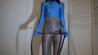 ACCO身穿蓝色zentai,外套一条油亮丝袜。