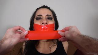 Bri has been hired as a house sitter. Unfortunately for her, the man who has been scoping the place out to rob it saw the owners leave and assumed the house would be empty. Of course, upon discovering Bri, he has to keep her out of the way and it might actually turn out to be a nice surprise for him. He grabs her and soon has her tied to a chair, her legs spread wide (done off-screen). He can’t have her yelling, so he shoves a scarf in her mouth and ties a white cloth between her teeth. He fondles her a bit and then goes to collect some valuables from the house. Bri struggles, unable to free herself from the chair. The robber enjoyed gagging Bri so he returns to do it again, this time working socks into her mouth and plastering 5 strips of red vinyl tape over her lips, matching her panties. He lifts her shirt, exposing her bra, and fondles and tickles her before continuing his robbery. The chair bound, barefoot beauty’s gagging woes aren’t over yet, though. Later, a pair of satin panties is shoved in her mouth and silver vinyl tape is wrapped between her teeth. He removes her bra and later adds more vinyl tape over her lips before making his getaway. Will Bri be able to get herself out or will she be stuck bound and gagged in that chair until the homeowners get back?
