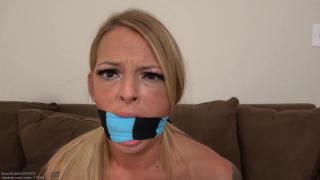 Bella Ink wants to fake a robbery so she can collect money from insurance without actually losing any of her stuff. She asks a friend to help her and he suggests that he tie her up to make it look convincing. She thinks this is a good idea and soon she’s stripped to her underwear and tied up (done off-screen). Her friend asks if she thinks the robbers would gag her and she says yes so he grabs a few socks to shut her up. She asks why they can’t just put a piece of tape on her mouth but her friend tells her that only works in the movies, crams a large sock in her mouth, and ties another sock between her teeth. After struggling and trying to talk through the gag for a bit, Bella tries to tell her friend to leave and call the police but he thinks the gag can be improved. Bella isn’t happy about this but gets her mouth packed with two hankies and black and blue electrical tape wrapped between her teeth. To Bella’s continued frustration, her friend wants to try one more gag. This time she has two pairs of panties stuffed in her mouth, blue 2-inch vet wrap between her teeth, pink 1-inch vet wrap over that, and finally a few turns of purple electrical tape. Those fictional robbers really wanted her gagged! Her friend hogties her as a final touch and then leaves to continue carrying out her plan. Hopefully it will prove to be worth all the trouble!
