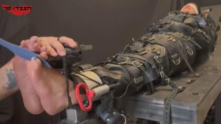 Toes are bound using a ratcheting system; ankles are secured with steel encasements and linchpins.