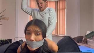 Tatti is tutoring maths during the holidays trying to make a little bit of extra money on the side between her studies. She's had someone contact her looking for her to do some tutoring. Tatti arrives in a pretty summer dress, it's so hot out! He answers the door and she introduces herself to him, she's so excited to teach! The student will be over soon so she's happy to wait. As she makes small talk with the step-dad suddenly he grabs her, mouth gagging her pulling her back! Soon after Tatti finds herself all tied up on the clients sofa! The step-dad had found her add in the newspaper and thought that Tatti was so cute and sweet that he wanted to see her for himself! Now it's a reality he can't believe his luck!! She's tied up on his sofa and he has fun with her! He fondles with her and gets her tits out and she's got such massive tits under that summery dress she's wearing. He pulls her knickers into her camel toe, what a tight shaven pussy she has. This is going to be fun!! She gets on her knees and swallows all of his cock! Not only is she good at maths it seems like Tatti is so talented when it comes to deep throating, she gasps for air as she is face fucked, he is getting so much pleasure from her gagging on his cock. He bends her over his sofa, Tatti, now tied and wrap gagged with tape so that the neighbours can't hear her muffled moans! He takes his cock and goes to put it in her little pussy but it's so tight, he really has to work it in. He gets to work on her, this is what he dreamed of. Thrusting his cock so deep into her pussy, mmmpphhh mmmppphhh Tatti moans into her wrap gag! He has her stood up now, bent over as he fucks her again and again. She then ends up back on the sofa with her legs up in the air, she is tied up so tight as she lays there as he continues to pound her pussy. His balls are so full after fucking this piece of pussy that he pulls out and blows all over her, Tatti then lays there dripping with cum!
