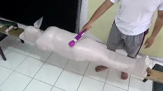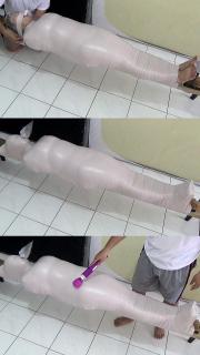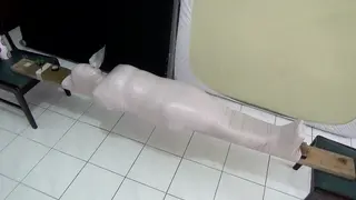 a girl tries to be wrapped tightly over a wooden block / pool until she is helpless.