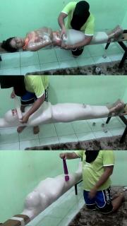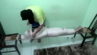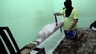 A beautiful girl is wrapped into a mummy with white duct tape on a large stick.