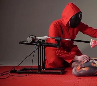 The Red Maniac's eyes gleam with excitement as he approaches me, his fingers tracing the curves of my stomach, teasing my navel with gentle, deliberate touches. My breathing quickens, my heart racing in anticipation of the pleasure to come. The pleasure machine he's brought with him seems ominous, but I know it's a harbinger of bliss.