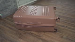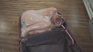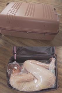 索尼娅在网上看到一款新的真空旅行箱,就下单订购了。行李一到,她就试用了一下。Sonya saw a new vacuum suitcase and ordered it online. As soon as it arrived, she tried it out.