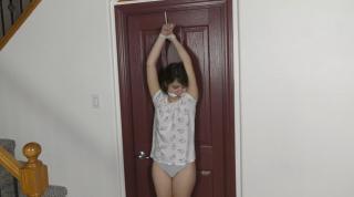 Mia faces down an intruder who doesn’t seem to want her valuables, but instead wants to see her in bondage! Dressed in a skimpy sleepshirt and thong panties, she is bound to the bed barefoot and cleave gagged and left alone to struggle. She manages to get herself free of the bed and immediately calls the police but as she hangs up, she realizes the intruder is still in the house!