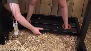 The farmer found a new milking position for her: the pillory! Let’s see if this works. It is a hard position for Britney, who is gagged and locked in a chastity belt. Her small udders need some work, but today it is time for nipple enhancement with the electronic breast training machine. The farmer turns it up to a very insane milking speed, and Britney wriggles, drools, and moans in the pillory. If only she would become a bit more docile… she probably just needs many more milking sessions!