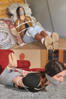 After a tense ride, the van stops at a remote wooden shed. Tony slings Lilith over his shoulder and carries her inside. Together with Alba, he reinforces her ropes, binding her even tighter. Left alone, Lilith pretends to be resigned, but inside she’s determined to prove herself. She struggles, testing the knots, and realizes the shed door looks weak. With great effort she kicks it down, making it open with her bound feet. For a moment, freedom seems within reach—but as soon as she reaches the doorway, Alba and Tony appear. They had been waiting outside, preparing her transfer. With cruel ease, Tony hoists her onto his shoulder again. Escape has failed.