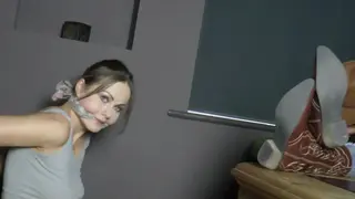Having tied the feisty explorer’s hands behind her back, Jess shoves her down on the ground, on her knees, and makes a call to her dark buyer. Problem is, the ravishing Miss Tina, in her hot little vest top and tight shorts, just doesn’t know when to shut up... Moments later, Jess is tightly gagging the cute little big mouth with her own patterned scarf. Silenced, Tina seethes, and as Jess hangs back to take a much-earned rest, the beauty powerfully struggles, but can’t get her tied wrists loose!