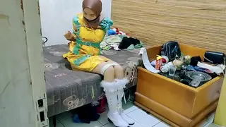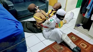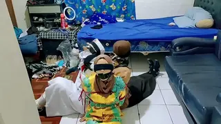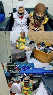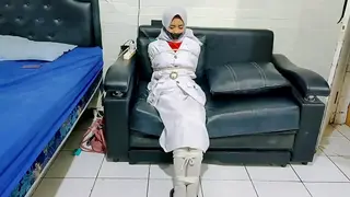 Three Hijab-Wearing School Girls Tied Together in a Room with Rope
