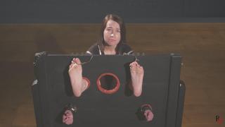 在这段视频中,Lada 被牢牢地固定在一套超大号的脚套上,舒适地坐着,手臂和腿通过特制的开口摆放。我和我的同事一起,对她的赤脚施加了独特的刺激组合——交替进行搔痒和更激烈的撞击——杖击。