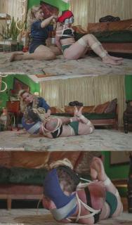 Things don’t get any better for Fayth. Once she is off of the stool she strips down to bra and panties and has to change panties. Panties get shoved into her mouth and tape seals them in tightly. Her arms are tied, she gets a crotch rope and panties over the head before getting hogtied barefoot on the floor. She get more wedgies and humiliation from JJ. Where will things go from here?