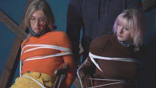 两位顶级探员踏上冒险之旅。安珀和蕾拉身着紧身毛衣、短裙、深色紧身裤和高跟鞋,显然是去错了地方。又或者,这是正确的地方?她们显然很享受被绑在椅子上,嘴上还被头巾堵住的感觉。Two top snoopers go on an adventure. Amber and Layla are in their tights sweaters, short skirts, dark tights and heels and clearly go to the wrong place. Or is it the right place? they clearly seem to enjoy being tied to a chair and cleavegagged with a bandana.