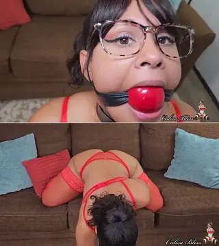 Calisa is very excited to see her master and promptly displays her big juicy ass for his enjoyment. She shows off by shaking and twerking and begging for attention. When she is given a ballgag she happily accepts it and licks the ball before stuffing it into her mouth. She once again shows off her body for master, wanting to please. She crawls around on all fours on comand and climbs onto the couch. She attaches her leash and offers it to her master. She doesn't complain as she is yanked around and lead on the leash like a puppy. Next, Calisa is bound with rope in a frogtie. She drools and drools, loving the attention while wiggling her body and moaning through the gag. She's such a good girl.