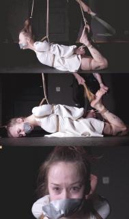 Her threats turn to muffled grunts when the sweaty socks come off and get stuffed past her painted lips, sealed in place with black vinyl tape that stretches from ear to ear. Now the real lesson begins.