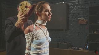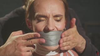Her mouth is stuffed with a sponge and sealed with layers of tape wrapped firmly around her head and mouth, forming a tight, flawless gag. You can hear her muffled sounds as she tests her limits, struggling to move, her hair falling over her face, the white ropes contrasting beautifully against her smooth skin.