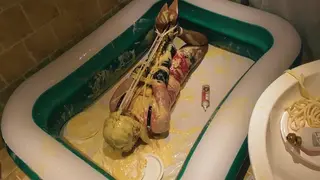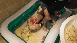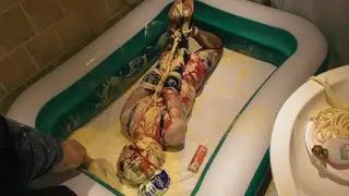 Nina is tied in sexy red undies, gagged and hooded with used panties. She is struggling to get free before getting covered in food with custard and cream pies in her face, down her panties and much more. Finally she is tied into an even tighter hogtie with her head pulled back and elbows together and sploshed some more until completely covered head to toe and left totally humiliated with no hope of escape.