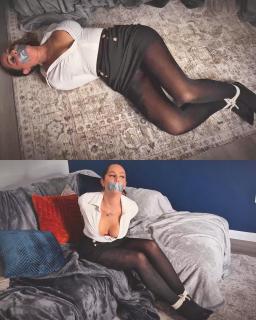 在昏暗的房间里,萨曼莎点燃了香烟。她坐下来,深深地吸了一口烟。她穿着尼龙袜、高跟鞋、黑色短裙和白色纽扣衬衫,开始放松下来。香烟摩擦着她涂着的红色唇膏,一个黑影透过半开的门向外张望。他做好了准备,从口袋里掏出黑色皮手套戴上,握紧拳头。萨曼莎背对着门坐着,一只黑色手套伸过来,无声地把门打开。他从戴着手套的手后面抓住她,捂住她的嘴。他们扭打在一起,他试图控制住她的胳膊。最终,当香烟在烟灰缸里燃烧时,她被完全制服了。她的脚踝和手腕被绑在沙发上,一条银色的胶带封住了她的嘴,她扭动着身子,发出“嗯嗯嗯嗯”的声音。In a dimly lit room Samantha lights her cigarette. She sits back as she inhales the smoke. Dressed in nylons, louboutin heels, a black skirt and a white buttoned down shirt she begins to relax. As the cigarette presses against her red lipstick a dark figure stands looking through a slightly ajar door. He prepares himself for what’s to come, removing his black leather gloves from his pocket he slips them on clenching his fists ensuring they are tight. Samantha sits with her back to the door as a black glove reaches around and swings it open silently. He grabs her from behind his gloved hand covering her mouth. They struggle as he tries to gain control of her arms. Eventually having her fully restrained as the cigarette burns in the ashtray. She’s tied on the couch at her ankles and wrists a silver strip of tape covers her mouth as she wriggles and mmmppphhhhssss.