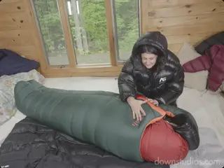 小姐姐身穿羽绒外套和羽绒裤入场,随后尝试各自钻进羽绒睡袋,最后发现两件睡袋可以叠在一起,制造双倍的快乐