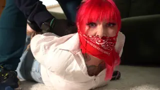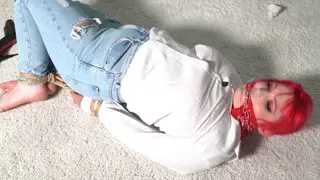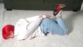 Jayne is in a white shirt and jeans. Put to the floor she is tied with old ropes. Her heels are taken off and her toes are tied together.