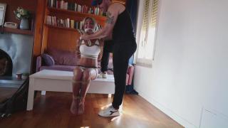 Tony the criminal is on the run from the police. He needs a place to hide so he breaks into a nearby flat. He nervously looks out the window and sees police cars in the neighborhood. Satisfied that they won’t find him, he relaxes and helps himself to a glass of water. Suddenly, we hear Eleonore coming in the door, talking to a friend on her mobile. Eleonore is wearing a short summer dress, her hair is down and her makeup and jewelry look very nice. Tony is panicking, unsure what to do but he overhears Eleonore telling her friend that Eleanore’s boyfriend has just made millions of euros in crypto. This gives him an idea: he will hold this lovely lady for as well as have a place to hide out until the police leave. Eleonor finishes her phone call, tells her friend goodbye and heads into the kitchen to make yourself a drink. Suddenly, Tony pounces on her, clamping his hand over her mouth and pinning her arms behind her back. He is very strong and rough with her. He warned her not to scream in that everything will be ok if she doesn’t. She is clearly terrified. Tony then drags her from window to window looking outside for the cops. He does this in each room, keeping her handgagged constantly. Finally satisfied, the police were gone, he warns her not to make any noise and he ties her hands behind her back. He then roughly handbags her again and says that he’s going to hide out in her place for a while, but he overheard her conversation and that she is going to call her boyfriend and get the millions of dollars transferred to Tony’s account. Keeping her tightly handgagged, he starts to realize how good looking she is and begins to grope her. Whatever she can tolerate, but ideally her boobs, but, legs, etc. She is clearly disgusted by his behavior. Tony has a very ungentlemanly idea and from his back pocket pulls out a gag. He gags poor Eleanore and bends her over a table. After that, the camera is close to Eleanor‘s face, and we can see Tony behind her. He lifts up her dress and begins to take her from behind. This goes on for a few minutes with her head bobbing up and down, tightly gagged face close to camera. She’s whimpering and begging him to stop. A few times, he pulls her hair or reaches over and handgags her as well. Tony sits a gagged Eleanor into a chair. She’s very close to the camera, we see mostly her face, it is, though she’s looking directly into a laptop. He tells her to call her boyfriend and begin the money transfer. At first, this is ridiculous because she’s gagged very tightly and we can’t understand what she’s saying. Annoyed, totally pulls the gag on her mouth and tells her to continue. She explains to her boyfriend that she’s been taken hostage and that he’ll have to pay the ransom. Tony leans down next to her ear, looks into the camera and tells the boyfriend: if you don’t pay, this is what will happen to your lovely girlfriend. He then clamps his hand over her mouth and nose with his other hand behind her head. Poor Eleanor thrashes, but she can’t scream. We next see her laying on the floor, in her underwear. Her wrists are tied behind her back, her angles are tied together. She’s very tightly wrapgagged, and she is also blindfolded on screen. It has occurred to Tony, that he can make a lot of money by keeping her. He picks her up and puts her over his shoulder and plans to leave with her. She regains consciousness and starts fighting, him to smother her again. The camera fades out, panning, our body, and ending on her blindfolded and gagged face, Tony is now satisfied cause Eleonore's boyfriend paid what Tony was asking, so the fugitive intruder leaves her on the floor in a very effective tight hogtie.