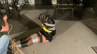 Secured to the floor by rings panty and tape gaged,. Blindfolded Boots fetish, superheroine, Sarah wild, DID, Tape Gag.