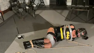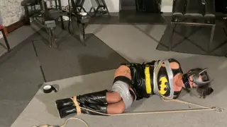 Batwoman Sarah Wild is captured searching the property for the evil villain. Bound and gagged in tape rope and steel cuffs