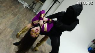 Lady X arrives on a mission of rescue—but she quickly becomes the victim. Mistaking a cosplaying fan for the real Lady X, Lady Nemesis abducted the wrong girl… yet feels no remorse. When the true Lady X shows up, Nemesis simply corrects the error—by overpowering her with devastating ease. The heroine is struck, strangled, frozen, mocked, and physically broken across multiple rounds of punishment. Her powers are nullified early on, leaving her to rely on grit alone—a poor match for Nemesis’ cold efficiency. Despite moments of resistance, Lady X is outclassed from start to finish, her every effort ending in pain and futility. Her connection to the kidnapped girl is only used to twist the knife, and even as she gasps from the floor, she’s offered no mercy. Bound and spirited away in the end, she isn’t just defeated—she’s claimed. And her suffering is far from over. This is a Squash Series video resulting in a one-sided defeat for Lady X.