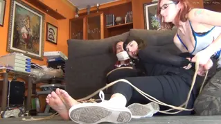 Nala esta tranquilamente en la habitacion con su movil. Sus amigas Beatrix y Margout entran en la habitacion con ella. “Hola chicas!”. Pero las intenciones de estas dos no parecen amigables. Rapidamente la asaltan. Beatrix le tapa la boca con la mano mientras Margout la ata con cuerda. “Estamos hartas de que tontees con nuestros novios!”, “MMMMMMMMMMMMMPPPPPPPPPPPPPHHHHHHHHHHHHH!!!!!!!!!!!”. Las chicas han decidido darle una leccion a Nala que no va a olvidar. Le quitan los calcetines y se los meten en la boca, luego la amordazan con una OTM gag. Despues de unos minutos, es Margout la que se acerca por la espalda a Beatrix y la ata a ella tambien por sorpresa. “Pero que haces?!”, “Que te crees, que no se que tambien hablas con mi novio?”, “Que? Nooooo! Eso no es..... MMMMMMMMMMMMMMMMMPPPPPPPPPPPPPPPHHHHHHHHHHHH!”. Misma mordaza para Beatrix. Margout ata a ambas chicas con cuerda. Las humilla y juega con ellas. Ninguna chica puede mandarse mensajitos con su novio, las consecuencias step-son acabar atada y amordazada!