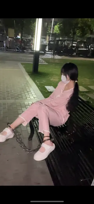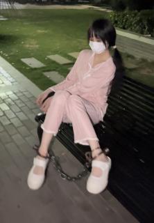 出小区走了很远的路,到躺椅上休息,玩一下镣铐,把手铐戴到脚腕上,然后又跑到栅栏上把手用手铐吊起来,期间妹子分享了一些戴脚镣手铐的感受,资深镣铐玩家。