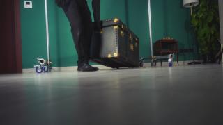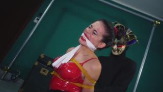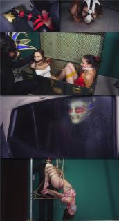 Once transported home, her gag is changed, and she now has a cleave to show off her full, red lips. He ties her up on stage with a TK to prepare her for what is to come, but in the meantime, voices and screams can be heard coming from the trunk behind them. Once opened, it reveals a girl in white underwear (Rey), also tied up with a TK and wearing a wrap of transparent tape filled with a staff on her legs, with a second layer of black adhesive tape.