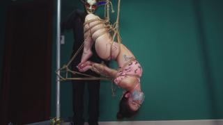 Once the trunk with Rey inside has been moved, the suspension point is now free to hang Fatima, now left in her pink underwear, in a reverse hogtie upside down, with her hands touching her feet!