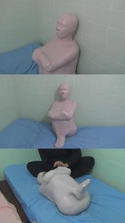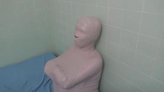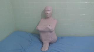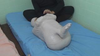A cute girl is tightly mummified in a sitting pose. This pose is an uncomfortable pose because it will feel tight. With this pose, the slave will never be able to break free because moving just a little is difficult.