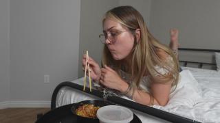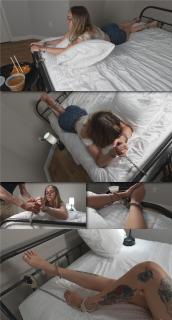 Autumn is brought into a room and made to lay face down on the bed. Her hands are cuffed to the other end. She is frustrated with the cuffs but is soon brought food and left to eat. After a few bites she starts to struggle against the cuffs to try and escape. When she is caught struggling against the cuffs, she is made to lay face up instead, with her feet shackled to the bed and her hands cuffed to the other side. Then after a few minutes struggling like that she is turned back over with her feet and hands still cuffed to the bed as punishment.